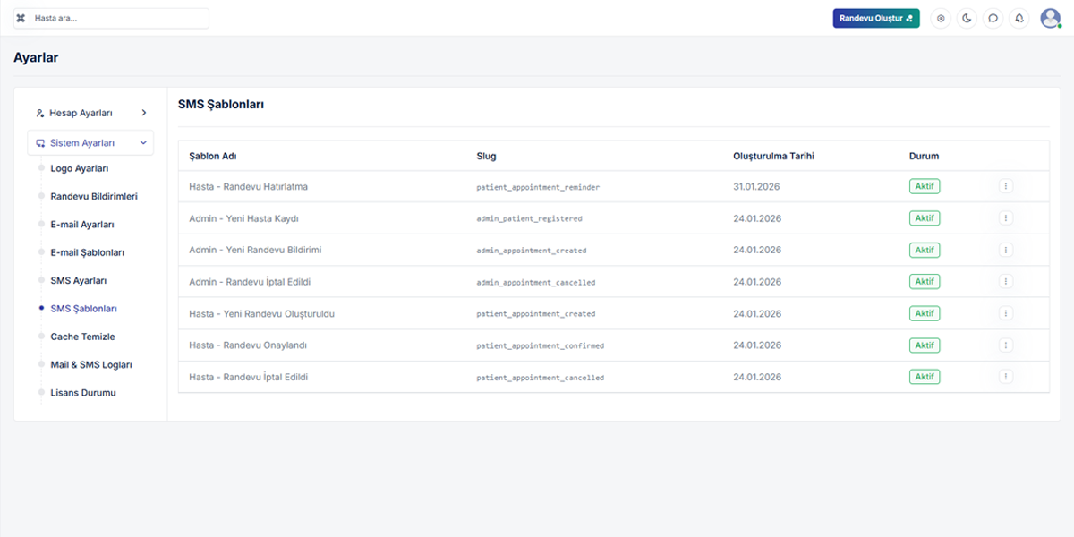 SMS Hatırlatmalı Randevu sistemi, randevuların unutulmasını önleyerek hasta memnuniyetini artırır. Otomatik mail ve sms bildirimleri sayesinde hastalar randevularını zamanında hatırlar, iptal oranları düşer ve planlama daha sağlıklı yapılır.